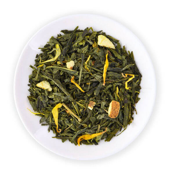 Thé vert bio, écorces d’oranges, poivre rose, coriandre, clous